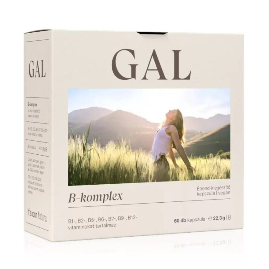 B1-, B2-, B5-, B6-, B7-, B9-, B12-vitaminokat tartalmazA B-vitaminok ún. aktív formái azok, amelyek a sejteken belül aktívak. Ezek közül a B1-, B2-, B5- és B6-vitaminok azonban nem képesek aktív formáikban hasznosulni, csak miután az egyszerűbb formáikra emésztődtek enzimek által. Ezek az egyszerű formák képesek csak a bélfalon keresztül a véráramba jutni és /vagy onnan a sejtekbe bejutni, ahol azután az aktív formáikká alakulnak. Emiatt az aktív formáik szedése – egyes tévhitekkel szemben – előnytelen, mivel drágább, miközben nem megspórolnak átalakítási folyamatokat a szervezetnek, hanem éppen, hogy további lépésekkel terhelik azt, sőt, a hasznosulásuk is kisebb. Mindenhol a megfelelő formát alkalmazzuk, azaz feleslegesen nem használunk ""divatos"" aktív formát, pláne, ha kifejezetten előnytelen.B3-vitamint a termékünk nem tartalmaz, mivel annak folyamatos fogyasztását kontraproduktívnak találjuk, így szerintünk olyan termékben nincs helye, amit napi szedésre szánunk. Hiánya csak annak lehet belőle, aki kizárólag finomított élelmiszereken él, ugyanis a természetes táplálékok széles köre bőségesen tartalmazza. Ellenben a krónikus túlfogyasztásával kapcsolatban felmerülnek problémák. Egyes esetekben érdemes lehet pótolni, de ilyenkor is mi inkább időszakosan és nem folytatólagosan javasoljuk, azaz nem naponta, hanem pl. havi pár alkalommal.Termékünk 1 kapszulában tartalmazza a GAL Multivitamin napi adagjában található B-vitaminokat, azonos formákban és mennyiségekben. Azoknak ajánljuk, akik függetlenül szedett más vitaminjaik, ásványi anyag-készítményük kiegészítésére keresnek gondosan összeállított B-vitamin-komplexet.Adagolási javaslat: Napi 1 db kapszula étkezéskor.Eltarthatóság: A dobozban található tasakot a szélein látható bevágás mentén, ollóval vágja fel, majd később gondosan zárja vissza, így tartalma negyed éven át fogyasztható marad.