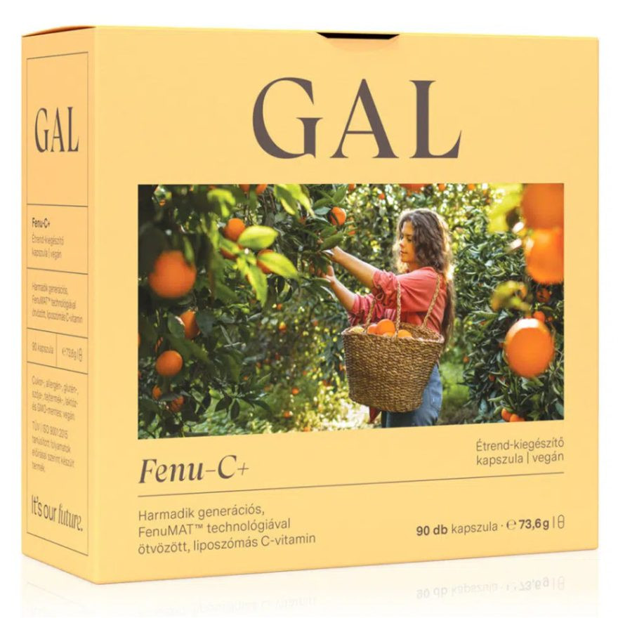 GAL Fenu-C+, 90 darab kapszula, FenuMAT™ technológiás készítmény, a C-vitamin szint folyamatos magasan tartására.A FenuMAT™ és liposzómás technológiák ötvözete új távlatot nyitott a C-vitamin szint növelésében, méghozzá kizárólag természetes összetevők felhasználásával.A C-vitamint természetes foszfolipidek által képzett liposzómákba zárják, majd azokat görögszénamagrostból előállított hidrogél-rendszerbe ágyazzák. Ennek révén már alig 360 mg így feldolgozott C-vitamin egyszeri bevétele is úgy megemeli a C-vitamin szintet, amennyire hagyományos C-vitamin semmilyen dózisa sem képes, de hozzá még liposzómásan feldolgozott C-vitaminból is grammos mennyiség szükséges, akár 10 g is. Termékünket azoknak ajánljuk, akiknek kifejezett célja a C-vitamin szint maximalizálása, szuprafiziológiás szint elérése, ill. azoknak, akiknek a hagyományos C-vitamin emésztési problémát okoz, vagy csak kényelmetlennek tartják annak napon belüli, egyenletes elosztását.Adagolási javaslat: Napi 1 db kapszula általános használat esetén, míg folyamatos C-vitamin szint maximalizálás céljából akár napi 9 db (pl. 3 db 8 óránként).Eltarthatóság: A dobozban található tasakot a szélein látható bevágás mentén, ollóval vágja fel, majd később gondosan zárja vissza, így tartalma negyed éven át fogyasztható marad.