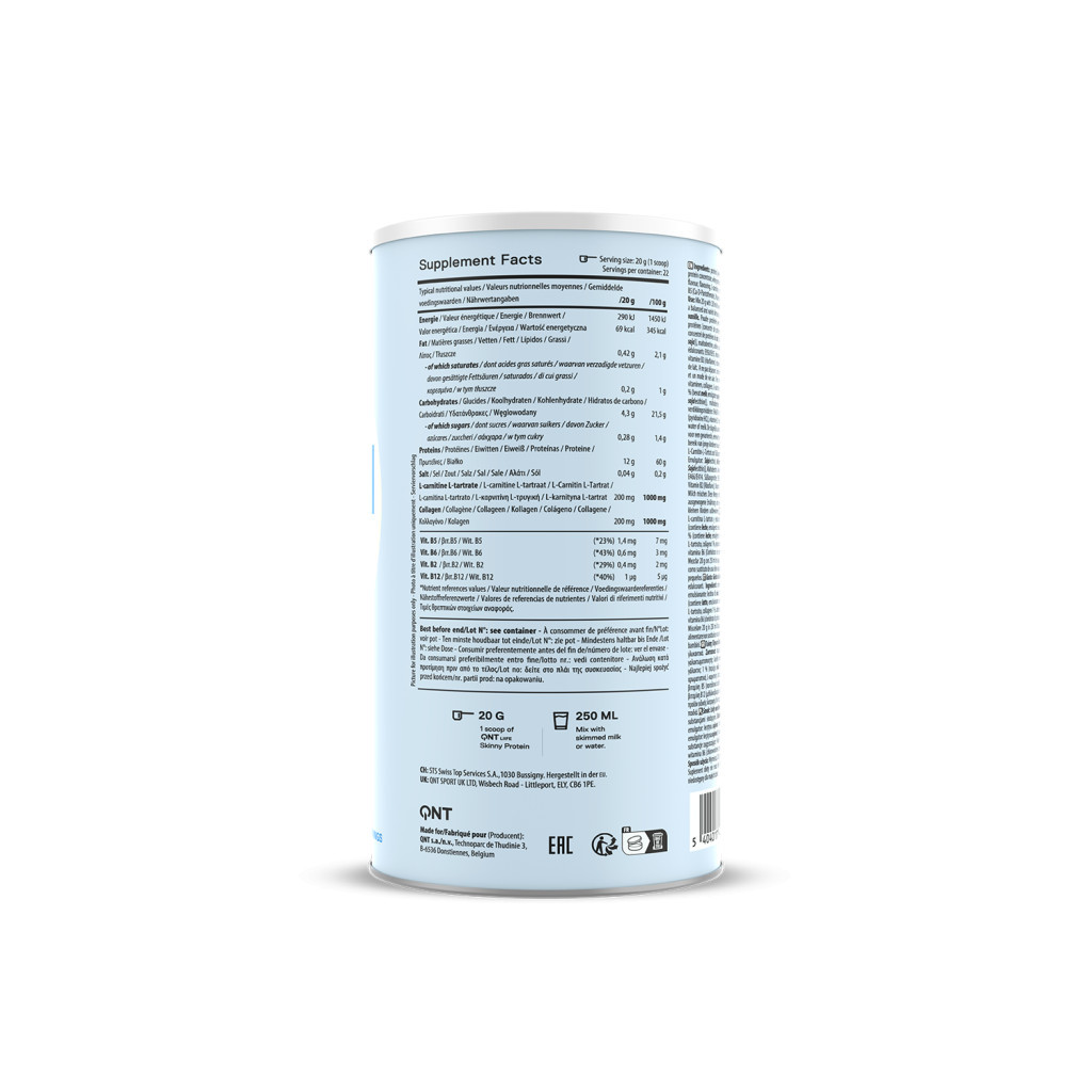 A QNT Easy Body Skinny Collagen Protein minőségi fehérjében gazdag valódi fehérje turmix hozzáadott cukor nélkül, L-karnitinnel és kollagénnel dúsítva a hatékonyabban fogyás, a bőr minőségének javítása és a megfelelő vitaminhiány pótlás érdekében (B2-, B5-, B6- és B12-vitamin). Alacsony szénhidrát- és lipid tartalmának köszönhetően értéket jelent mindazok számára, akik egyesíteni akarják a vitalitást, a jólétet és a kiegyensúlyozottságot.A QNT Easy Body Skinny Collagen Proteint kifejezetten a zsírégetés elősegítésére, az edzés közbeni állóképesség javítására és a gyönyörű bőr megőrzésére fejlesztették ki. L-karnitin és kollagén összetétele kettős hatást gyakorol a bőr védelmére és a fogyás elősegítésére.